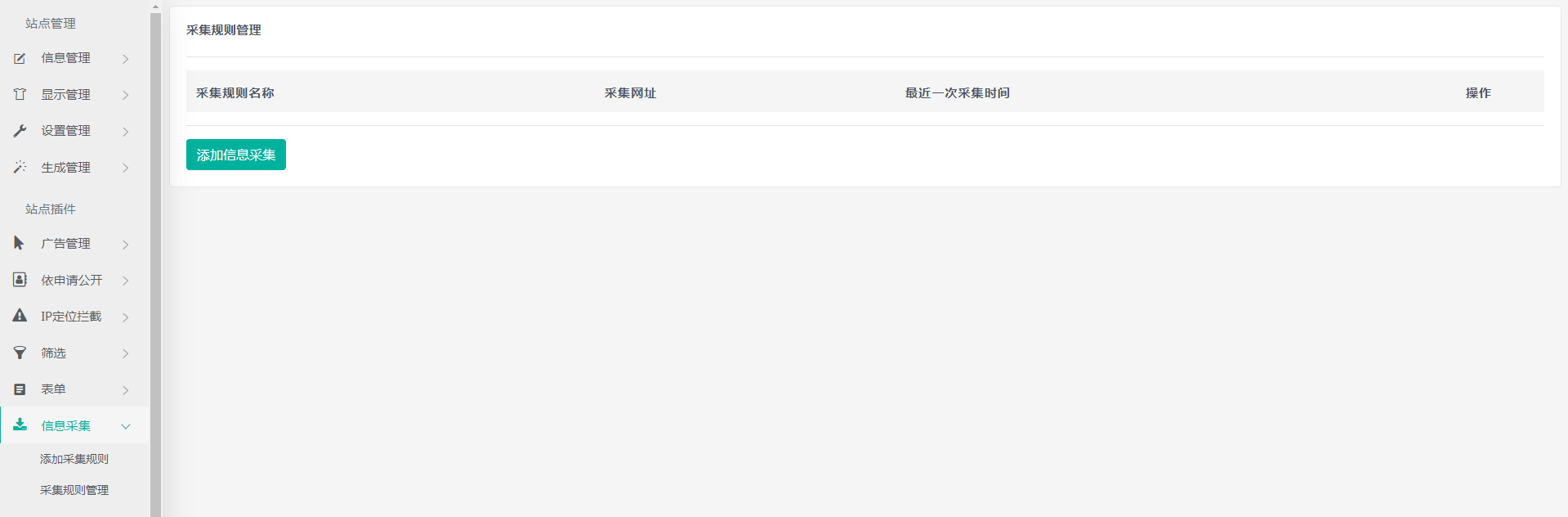 点击系统左侧- 站点插件 下的 信息采集 右侧进入界面是采集规则管理。然后点击添加信息采集