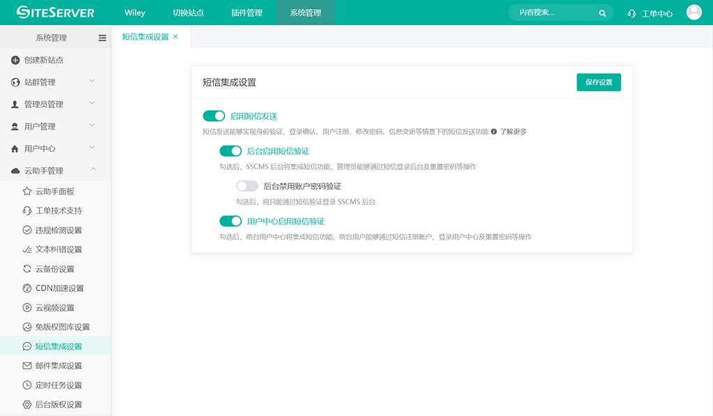 勾选后,SSCMS 后台将集成短信功能,管理员能够通过短信登录后台及重置密码等操作。