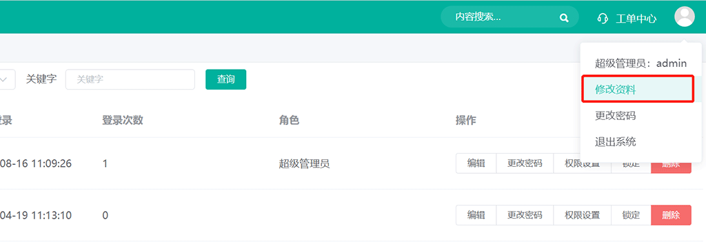 如果需要修改的管理员为自己,则需要将鼠标移至后台右上角的头像上,在弹出的下拉菜单上选择修改资料: