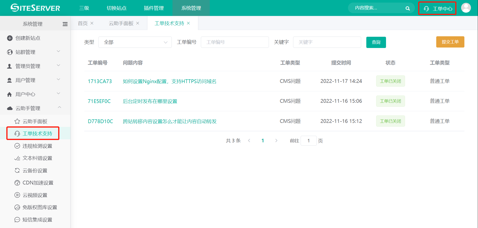 如果是超级管理员登录后台,可以点击 系统管理 -> 云助手管理 -> 工单技术支持 菜单进入工单管理界面,如果是普通管理员,可以在管理后台右上角点击 工单中心 进入工单管理界面: