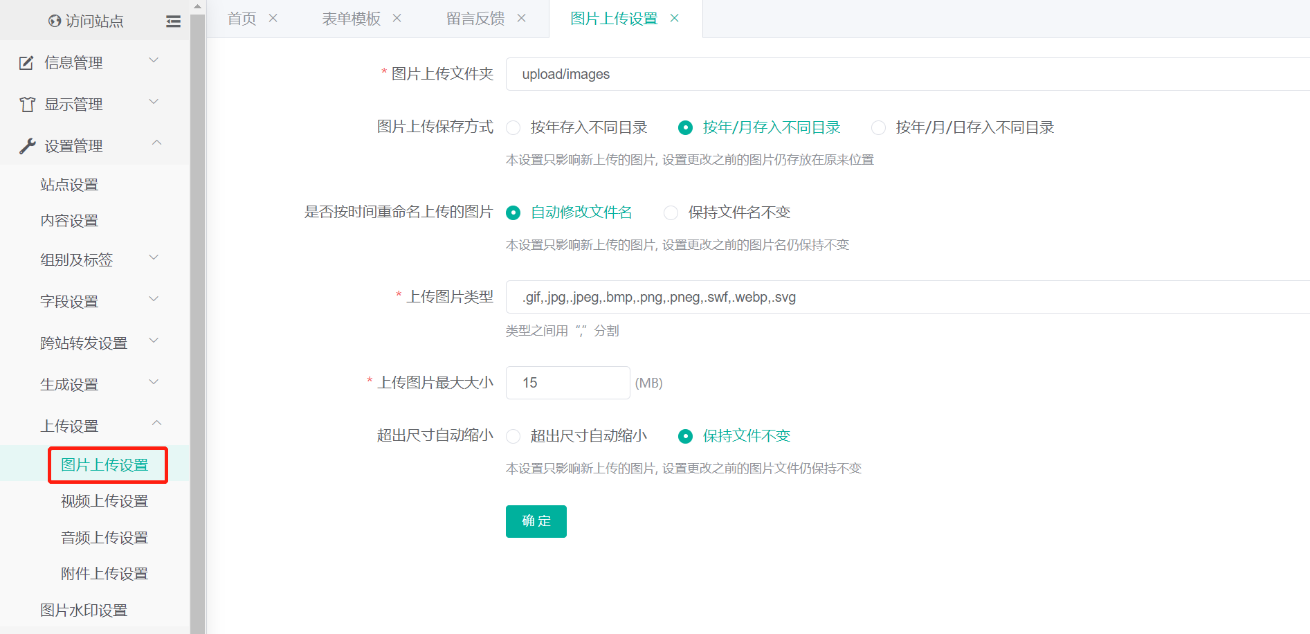 图片上传控件的上传限制规则与 设置管理 -> 上传设置 -> 图片上传设置 中的规则一致: