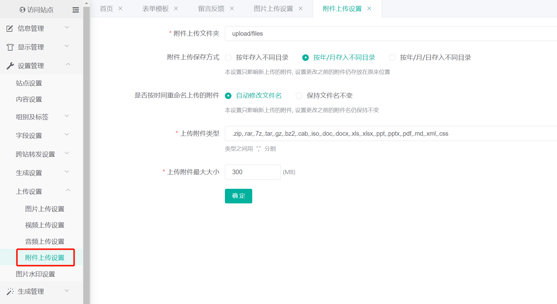 文件上传控件的上传限制规则与 设置管理 -> 上传设置 -> 附件上传设置 中的规则一致: