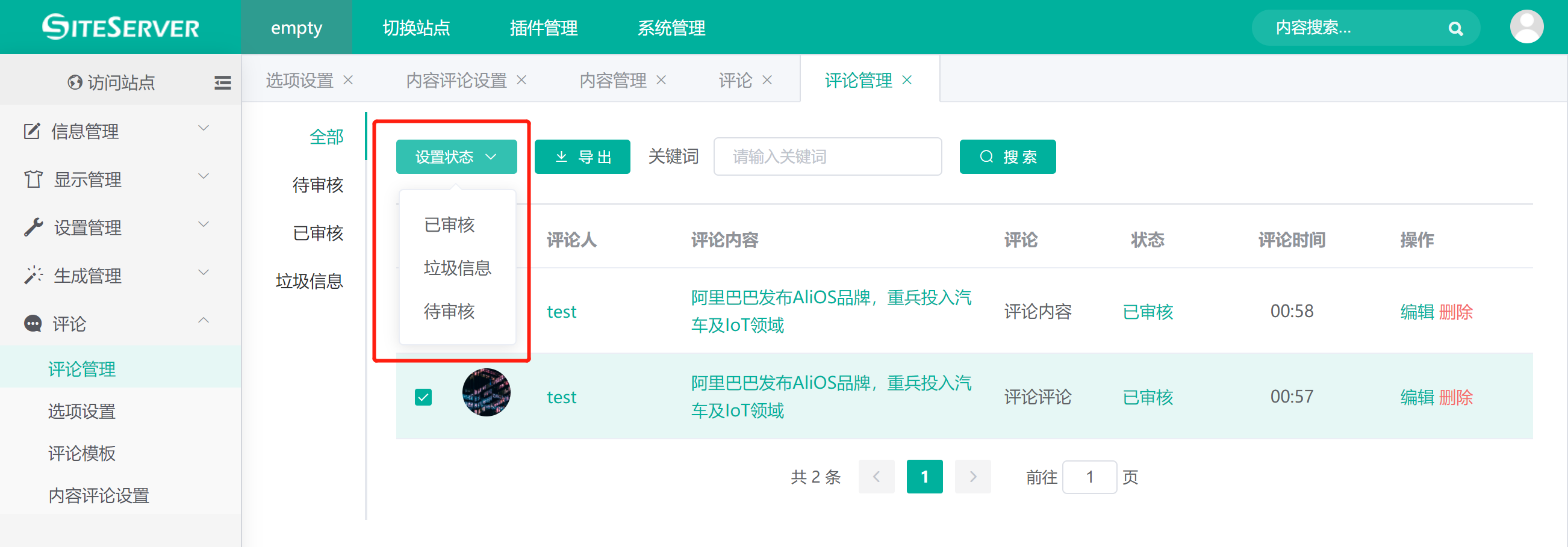 点击站点 评论 -> 评论管理,进入评论管理界面,评论管理将显示站点所有内容的评论列表。