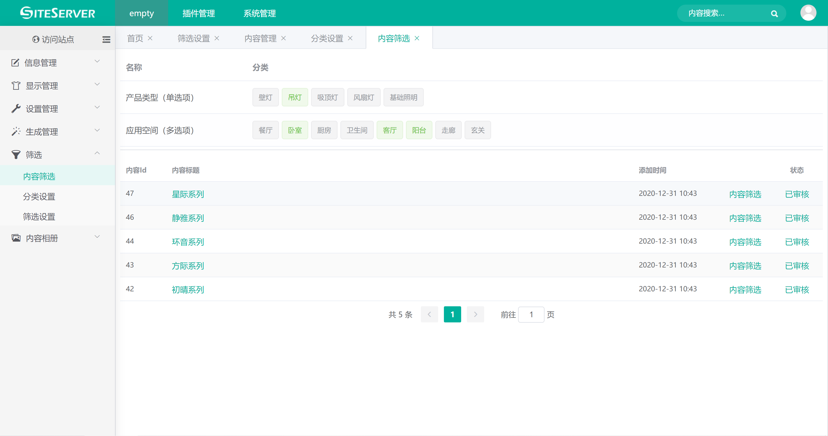 默认将显示 筛选设置 中勾选的栏目下的所有内容,点击对应的筛选项进行筛选,系统将通过分类查询出符合筛选条件的内容列表: