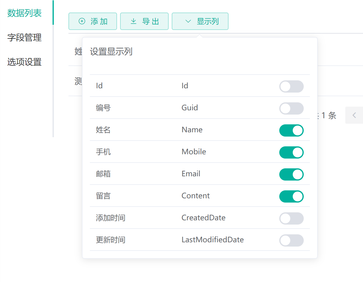 在表单管理界面中,左侧可以切换数据列表、字段管理与选项设置,下面我们分别进行说明: