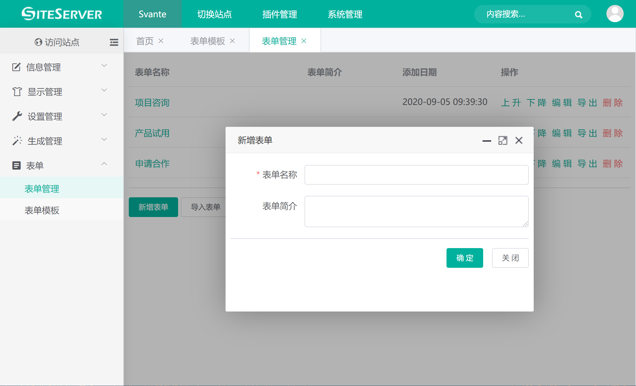 首先,在 SSCMS 管理界面中打开 表单 -> 表单管理 菜单,点击 新增表单 按钮: