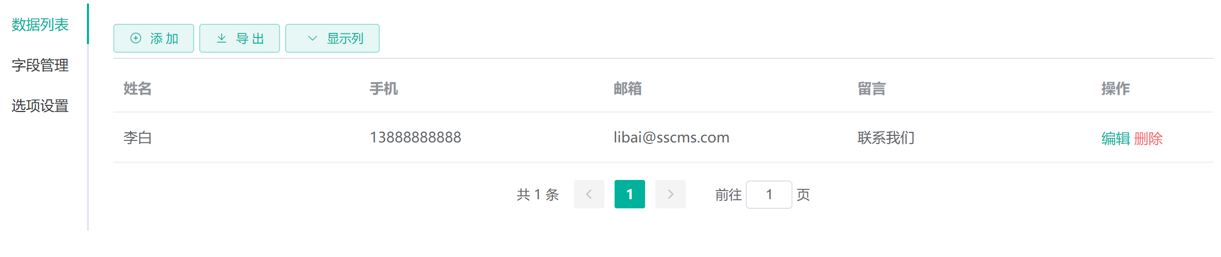 再此进入 表单 -> 表单管理 菜单,点击联系我们表单,进入联系我们表单管理界面: