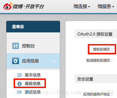 登录微博开放平台 (opens new window) ,选择[管理中心]->[我的应用]->[“您的应用名”]->展开左侧[应用信息]->[高级信息]->OAuth2.0 授权设置 右上角[编辑]->在框里填入回调地址即可。