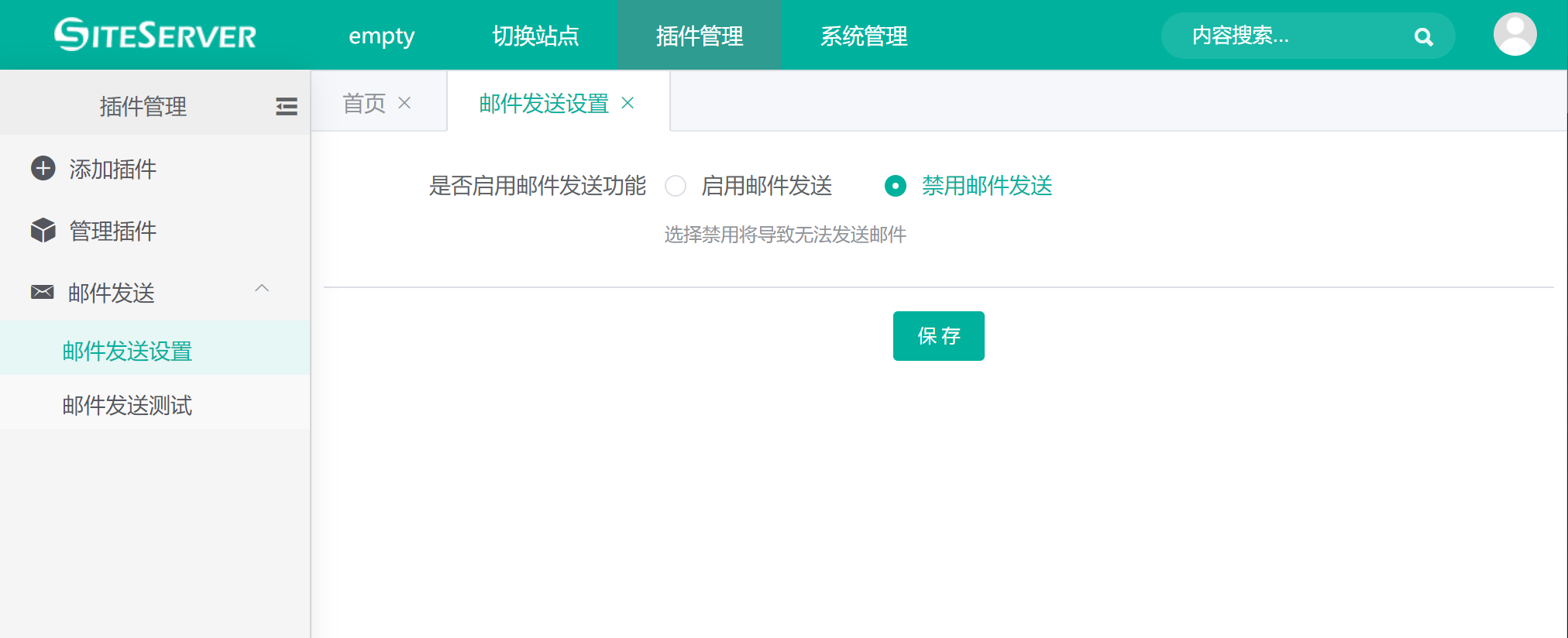 登录插件安装好之后,进入插件管理,左侧菜单下将出现邮件发送插件管理菜单,如下图所示:
