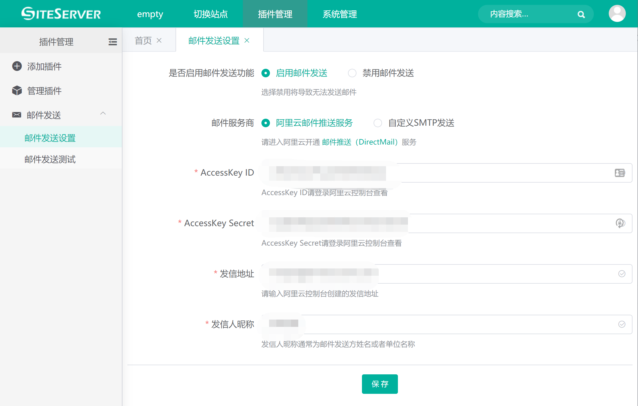 完成阿里云邮件推送服务开通及发信准备工作后,就可以进入邮件发送插件进行参数设置了,设置完毕参数后邮件发送插件才能够正常工作。