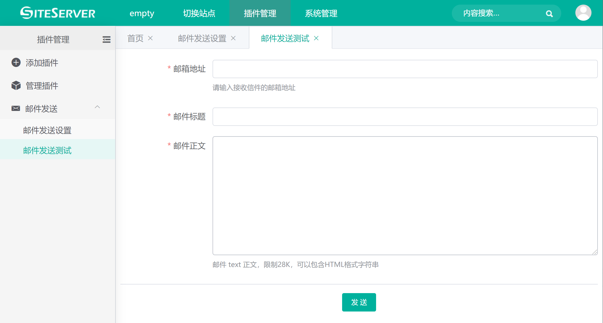设置完成后进入邮件发送测试菜单,填入收件人邮箱、邮件标题及正文,点击发送。