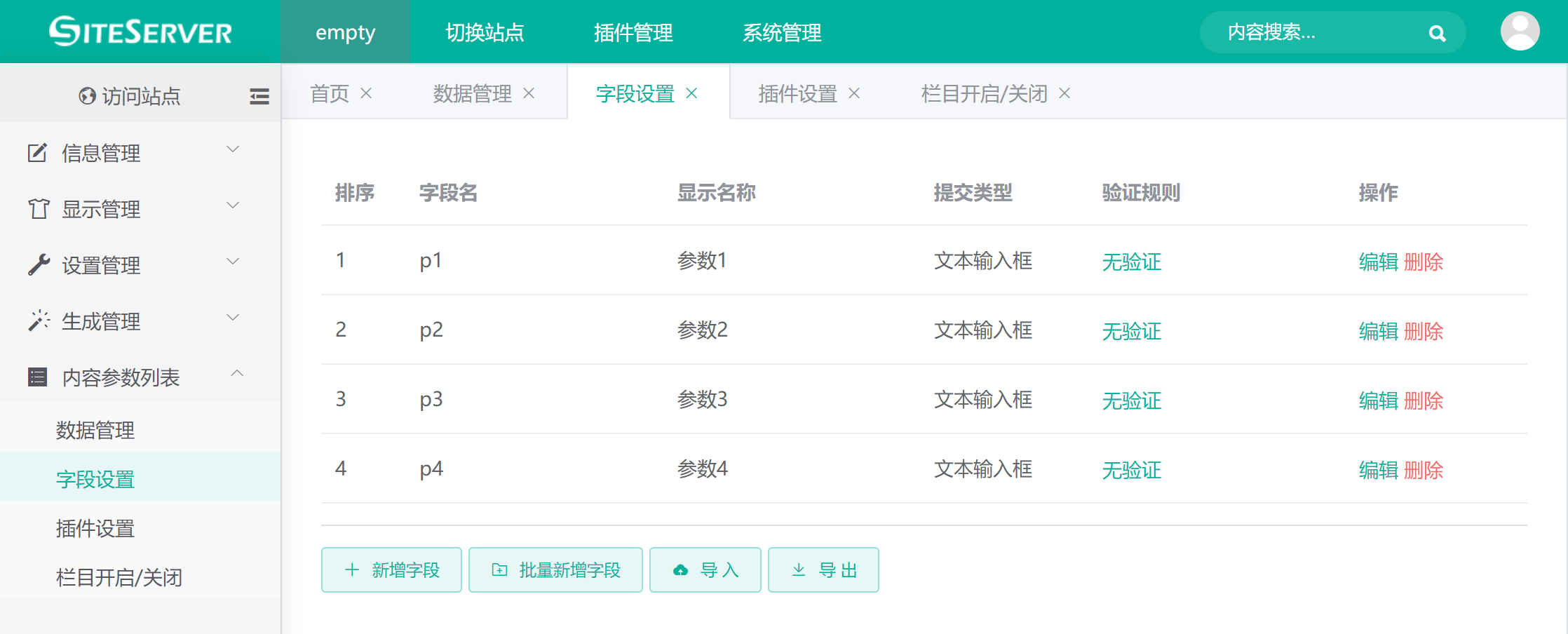 进入站点 内容参数列表 -> 字段设置 界面,可以看到内容参数字段: