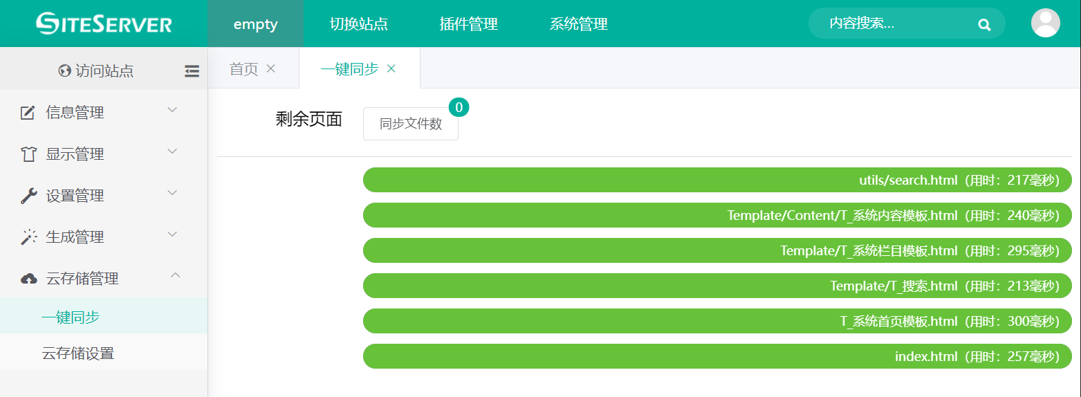 完成云存储设置后,点击 云存储管理 -> 一键同步 菜单,就可以将站点文件同步至云存储中了: