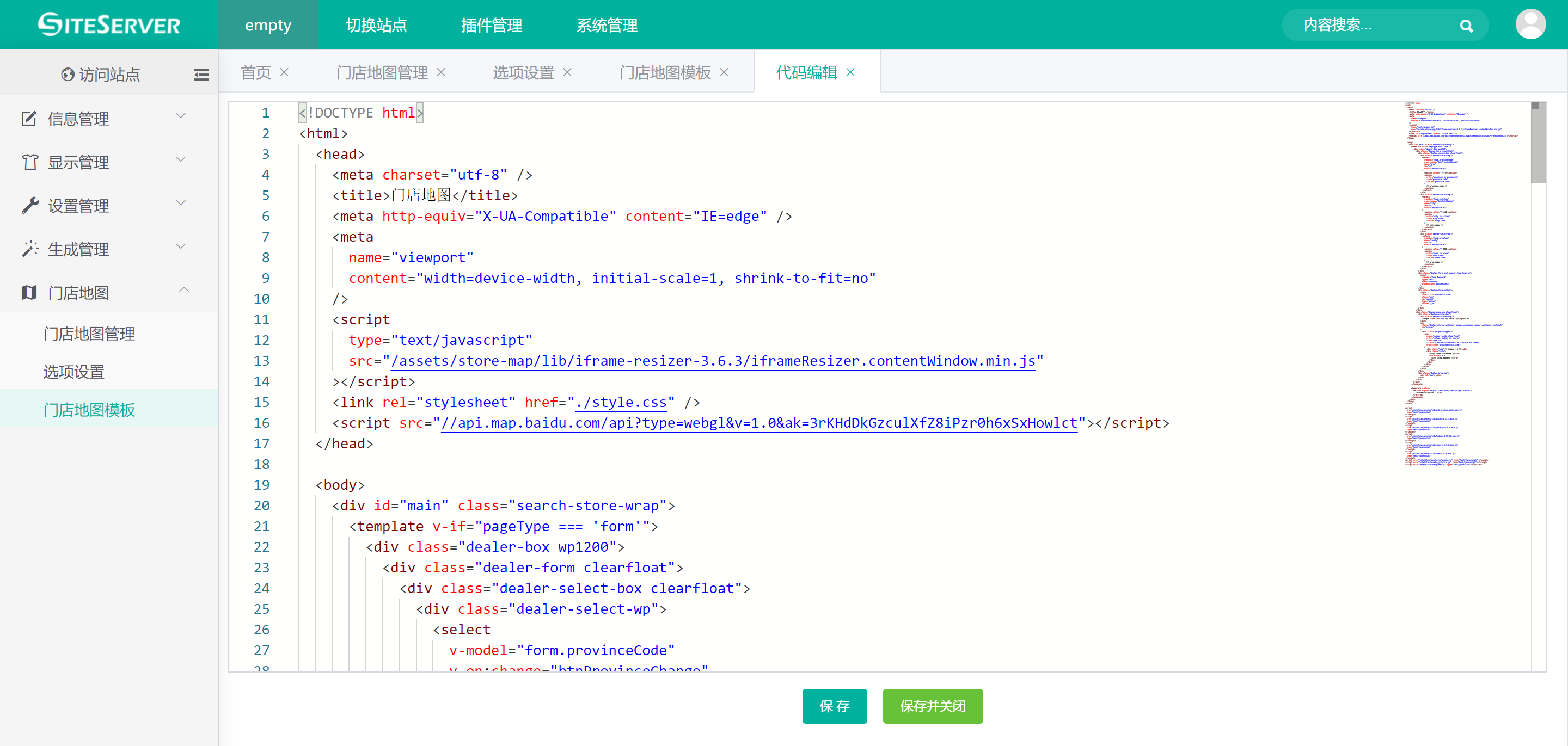 在 SSCMS 管理界面中打开 门店地图 -> 门店地图模板,点击默认模板style1的代码编辑:
