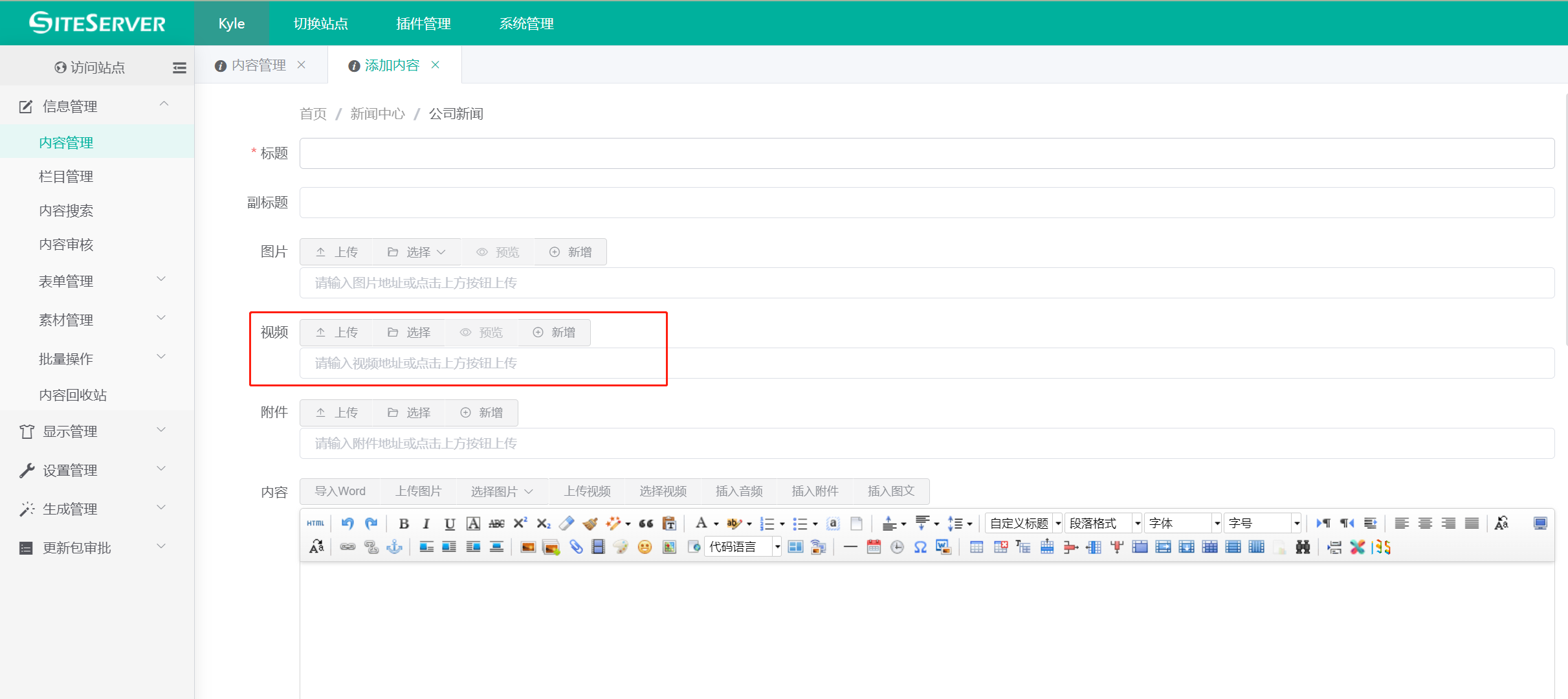 我们进入 SSCMS 后台内容管理界面,点击添加按钮,进入内容添加界面:
