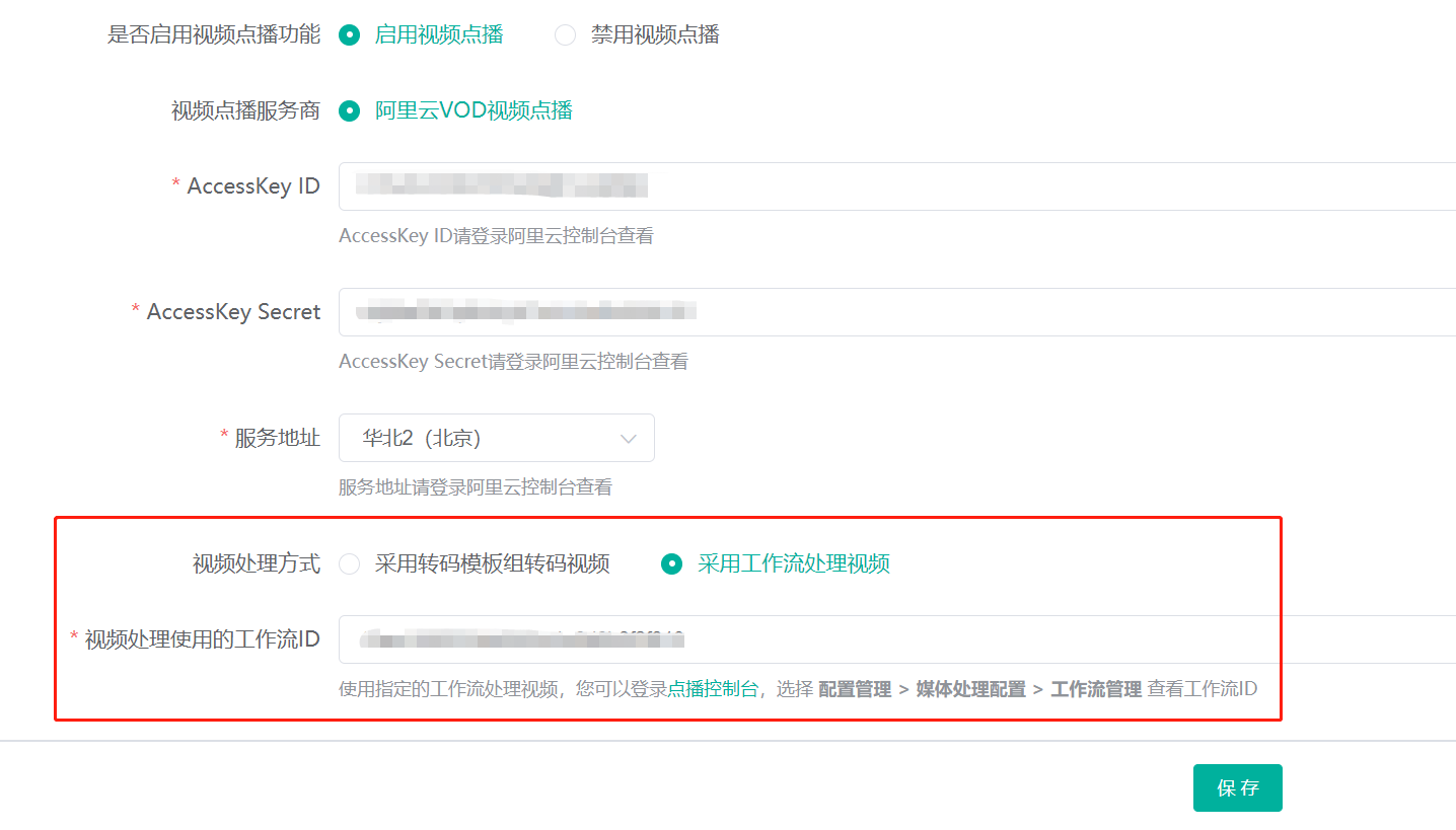 接下来,我们进入视频点播设置界面,将视频处理方式设置为采用工作流处理视频并将视频处理使用的工作流ID设置为阿里云控制台中添加工作流的ID值: