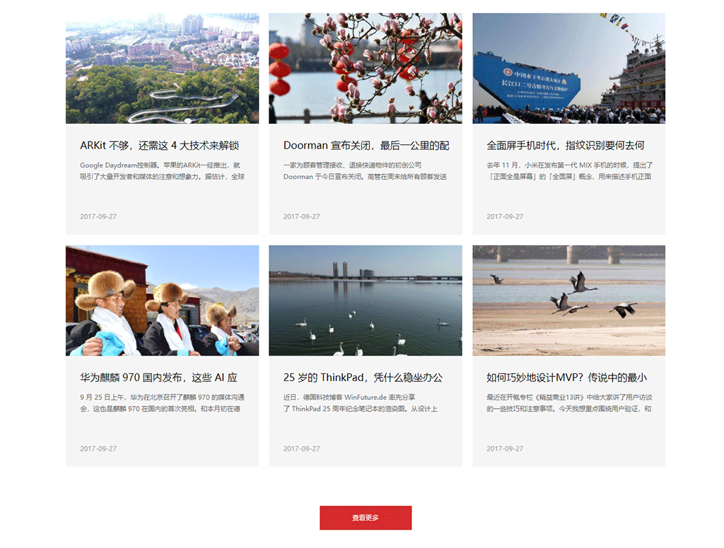 下面的例子在栏目模板中显示6条内容,点击 查看更多 按钮后依次加载内容列表,每次加载6条。