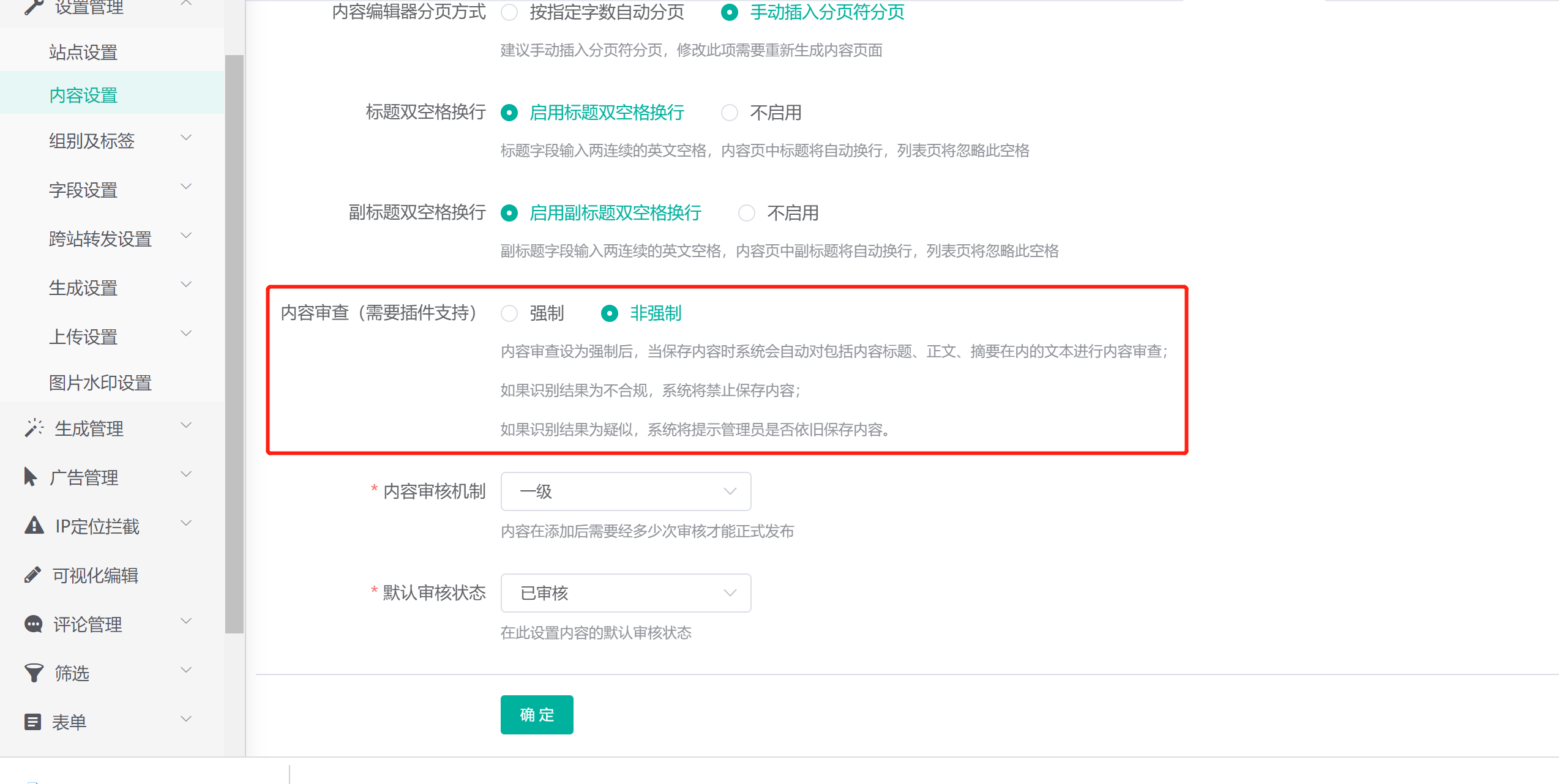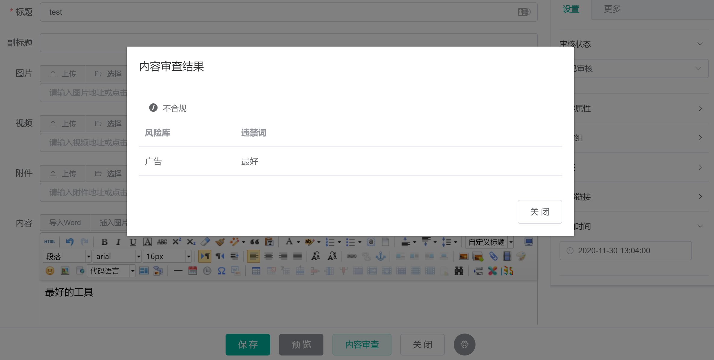 - 内容审查设为强制后,当保存内容时系统会自动对包括内容标题、正文、摘要在内的文本进行内容审查;