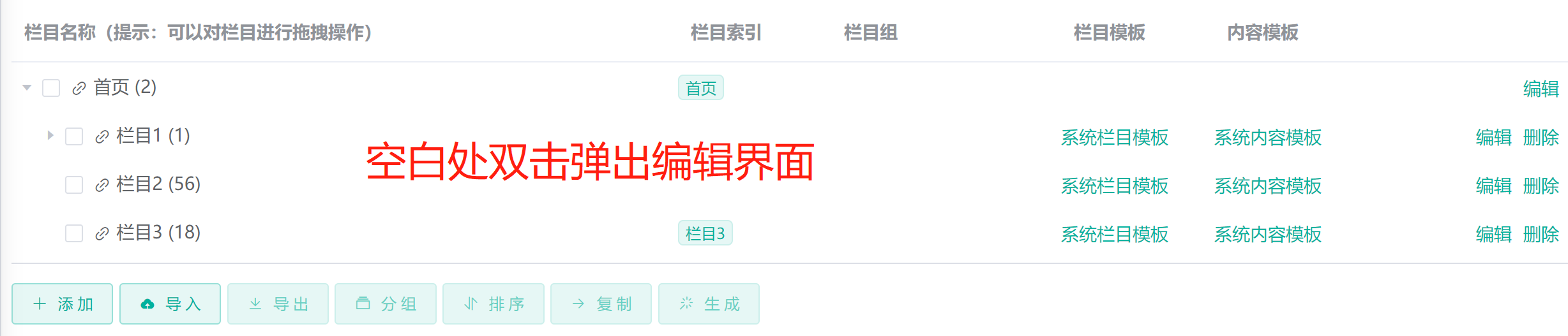 新版本优化了后台栏目列表以及内容列表的使用体验,现在可以通过双击实现快速弹出编辑页面功能: