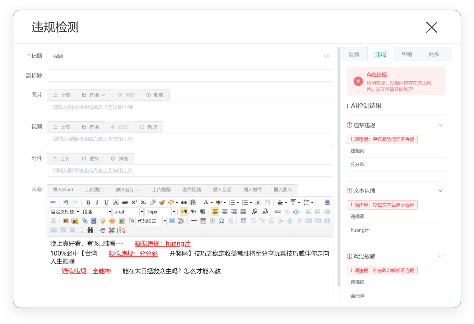 内容违规检测基于AI自然语言理解、深度学习等技术,有效识别违规文本内容,具备拼音、谐音、拆字、形近字、影射等变体识别能力。