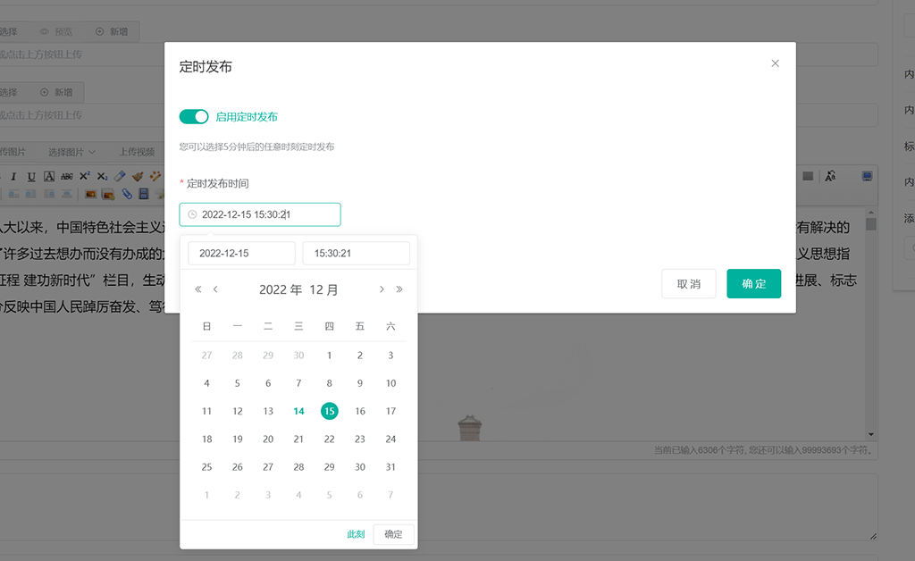 除了手动添加定时任务,我们还可以在内容编辑界面中按照指定时间发布内容: