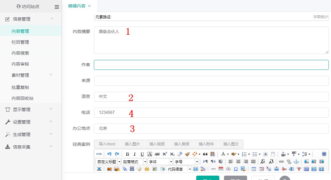 进入 SSCMS 后台 信息管理 -> 内容管理 界面,点击栏目 高级合伙人: