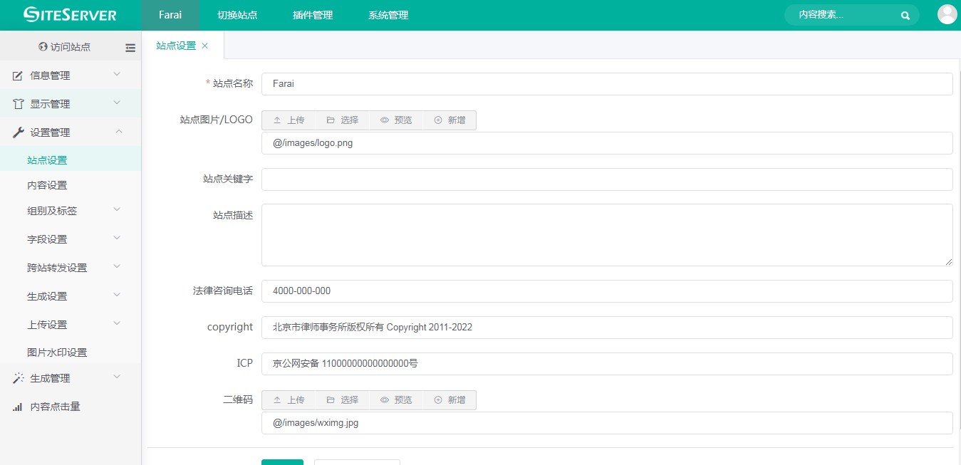 进入 SSCMS 后台 设置管理 -> 站点设置 界面:
