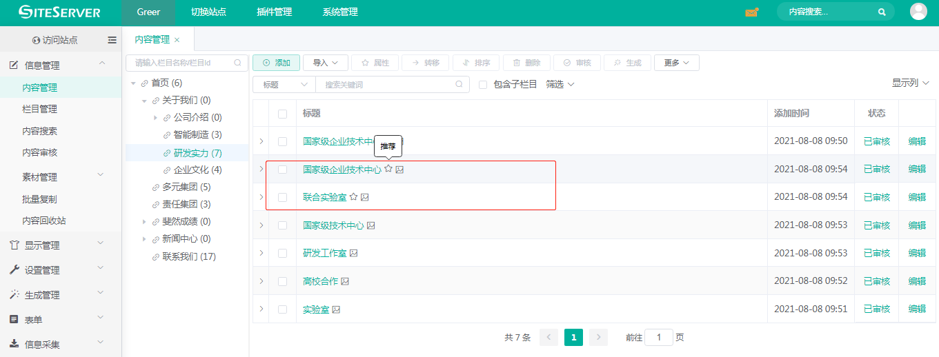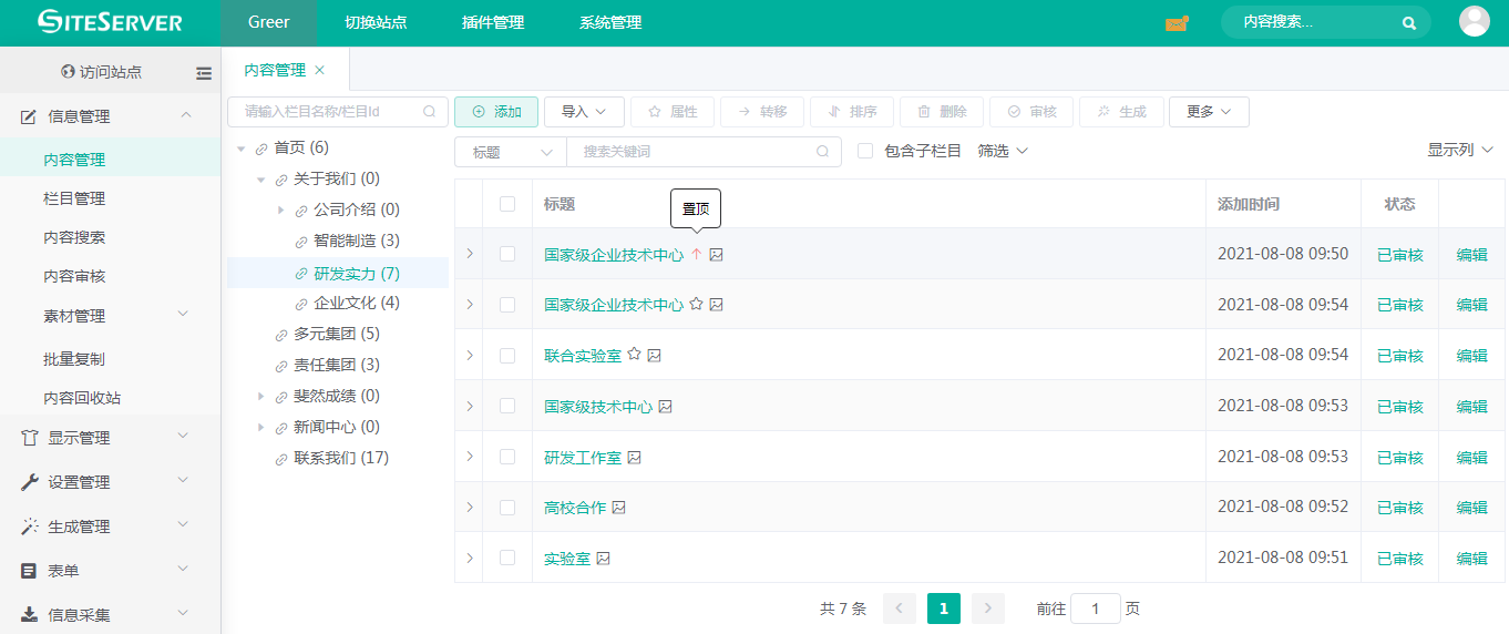 进入 SSCMS 后台 信息管理 -> 内容管理,我们可以看到第一条置顶内容,就是研发实力简介内容