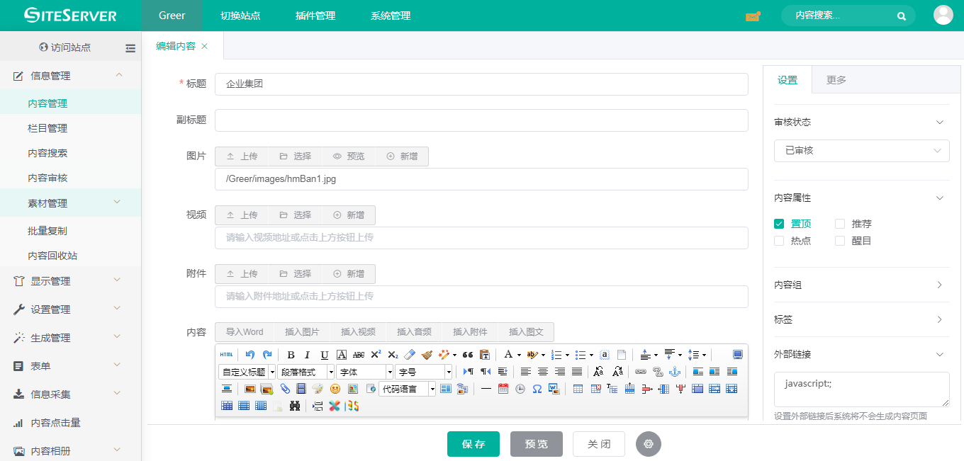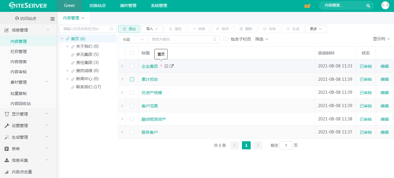 进入 SSCMS 后台 信息管理 -> 内容管理 界面,点击栏目 banner,我们可以看到后台第一条置顶内容和其他五条内容: