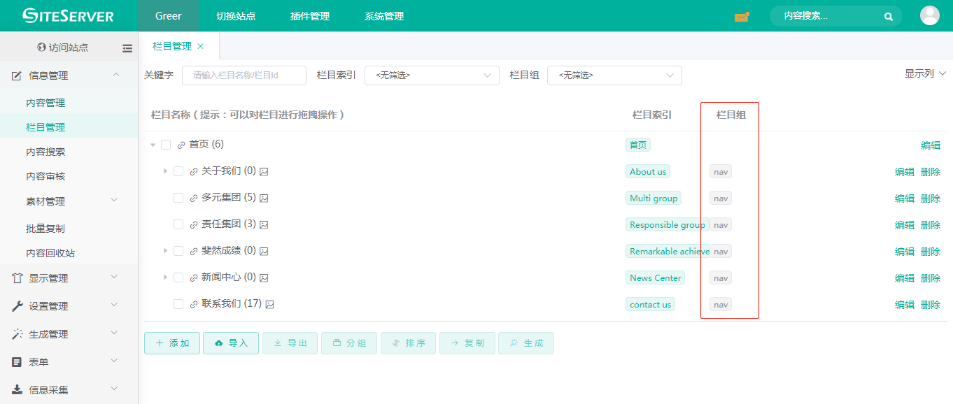 进入 SSCMS 后台 信息管理 -> 栏目管理 界面,我们能看到栏目组一栏,设置了 nav ,