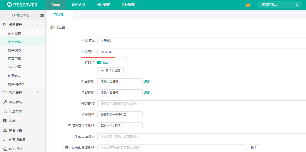在此勾选或者取消勾选对应的栏目组,用以设置指定栏目是否显示在对应的导航中。