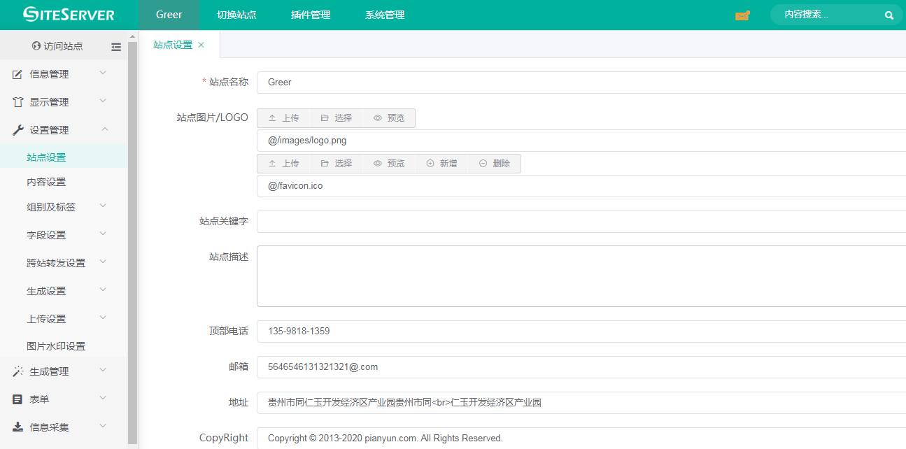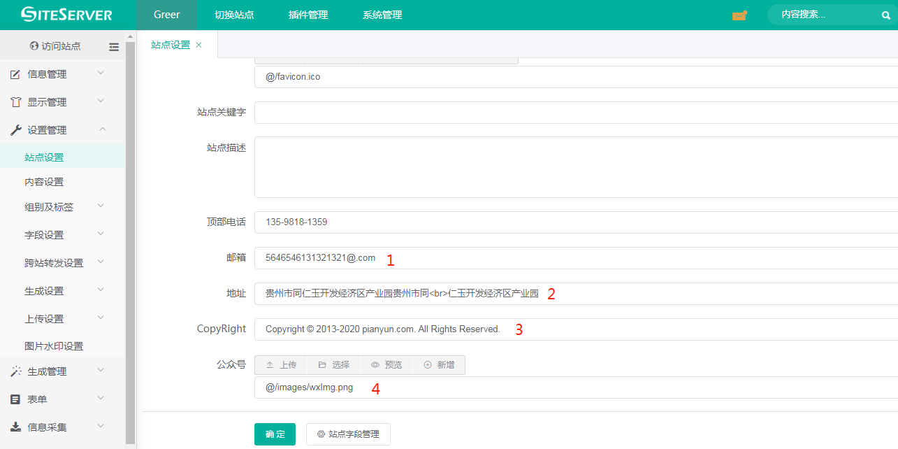 使用 Greer 模板创建站点后,我们需要将站点名称、LOGO、、电话、邮箱、地址、CopyRight等信息替换为正式数据。