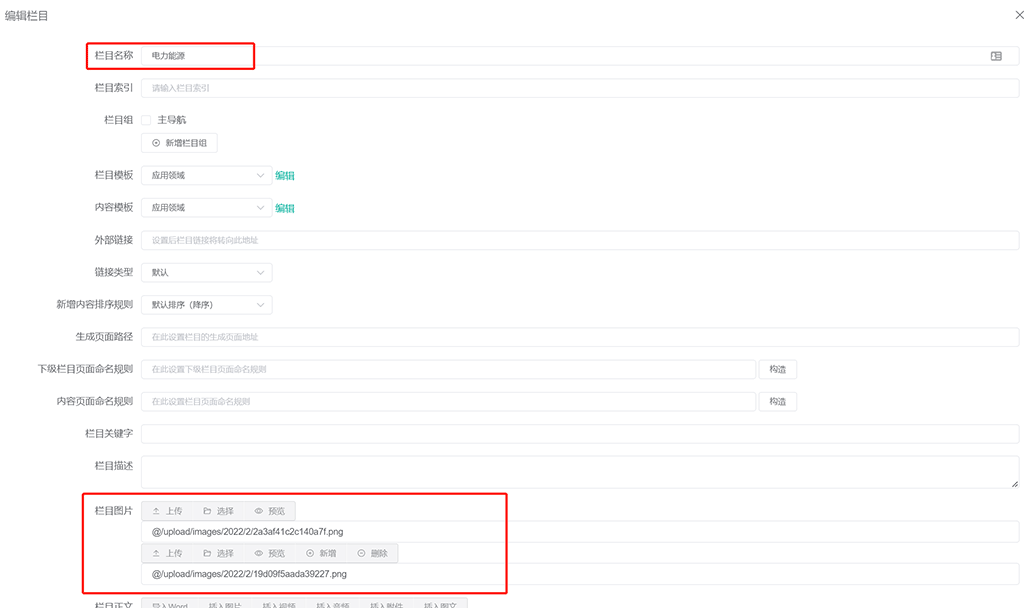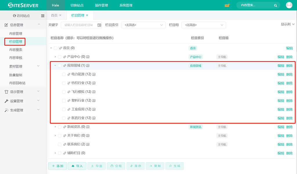 进入 SSCMS 后台 信息管理 -> 栏目管理 ,我们可以看到 应用领域 栏目下的子栏目: