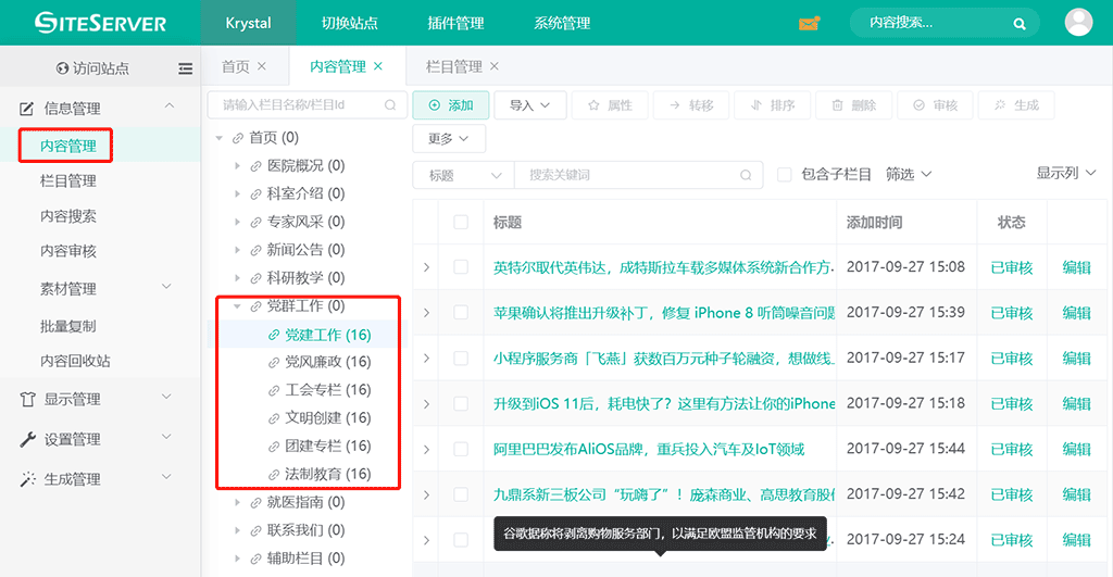 进入 SSCMS 后台 信息管理 -> 内容管理 界面,点击栏目 党群工作,我们可以看到党群工作子栏目: