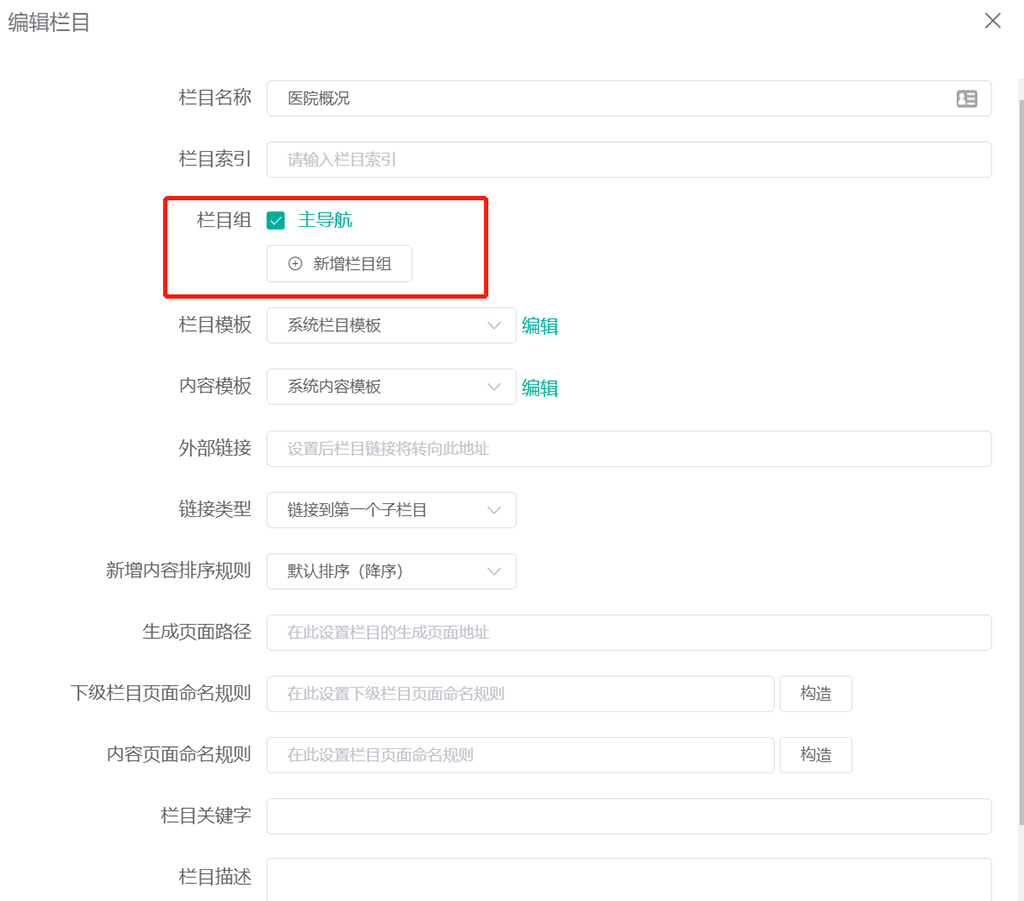 在此勾选或者取消勾选对应的栏目组,用以设置指定栏目是否显示在对应的导航中。