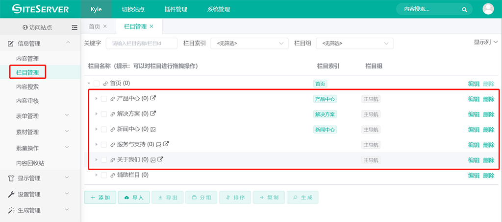 点击栏目右侧的 编辑 按钮,进入栏目编辑界面: