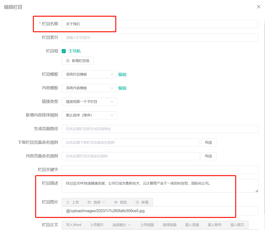 在此编辑栏目名称、栏目描述以及栏目图片,修改完成后需要重新生成页面,刷新浏览器即可看到栏目页及内容页的变化。