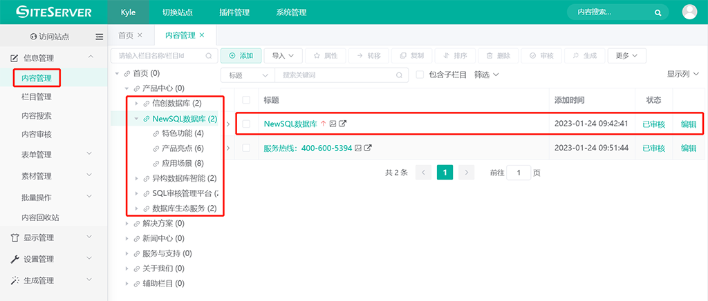 进入 SSCMS 后台 信息管理 -> 内容管理 界面,进入产品栏目内容列表页: