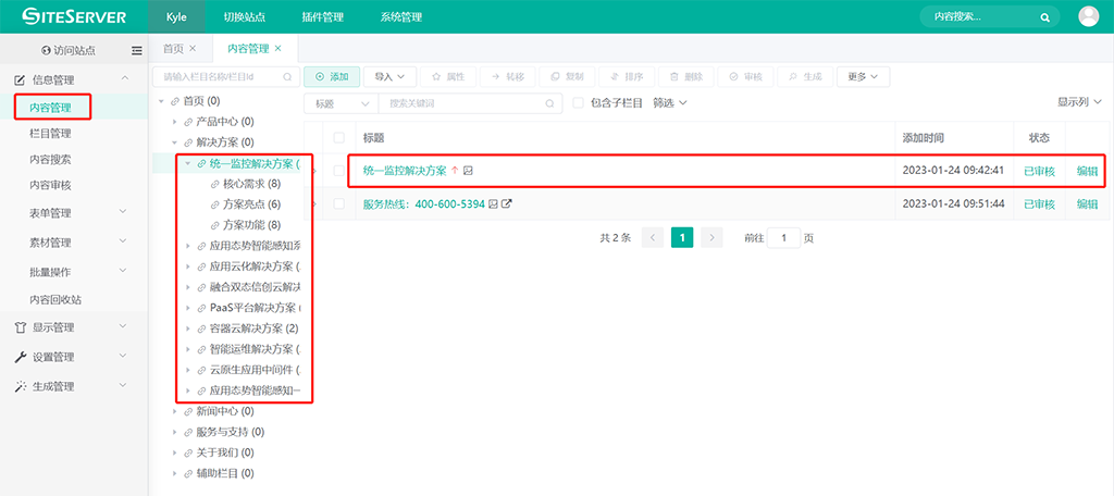 进入 SSCMS 后台 信息管理 -> 内容管理 界面,进入解决方案栏目内容列表页: