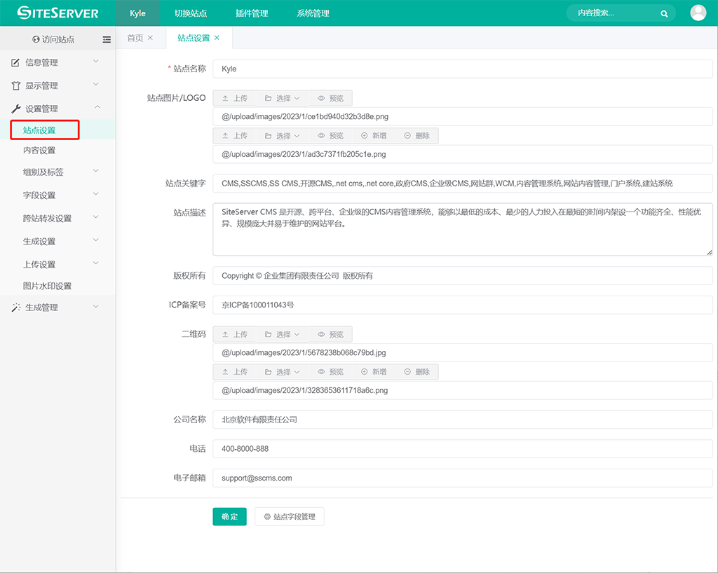 进入 SSCMS 后台 设置管理 -> 站点设置 界面: