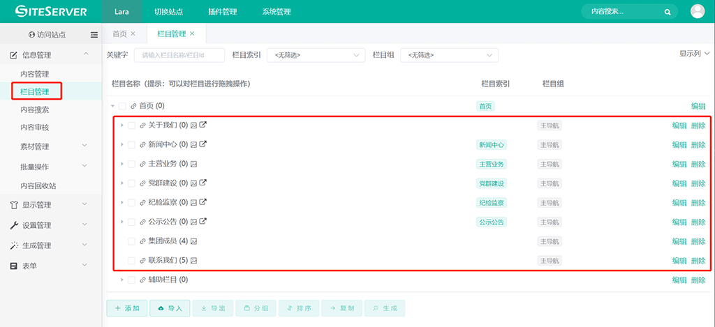 点击一级栏目右侧的 编辑 按钮,进入栏目编辑界面: