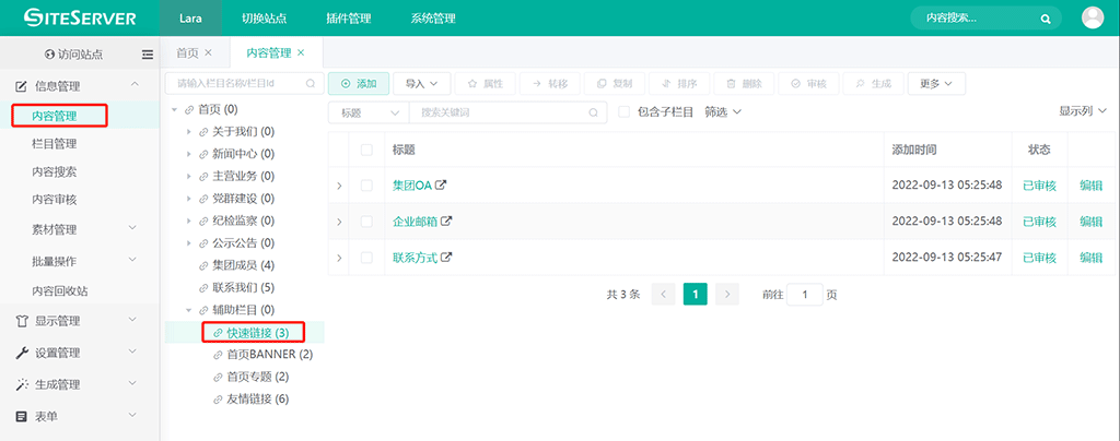 进入 SSCMS 后台 信息管理 -> 内容管理 界面,点击栏目 快速链接,我们可以看到页面中展示的3条链接: