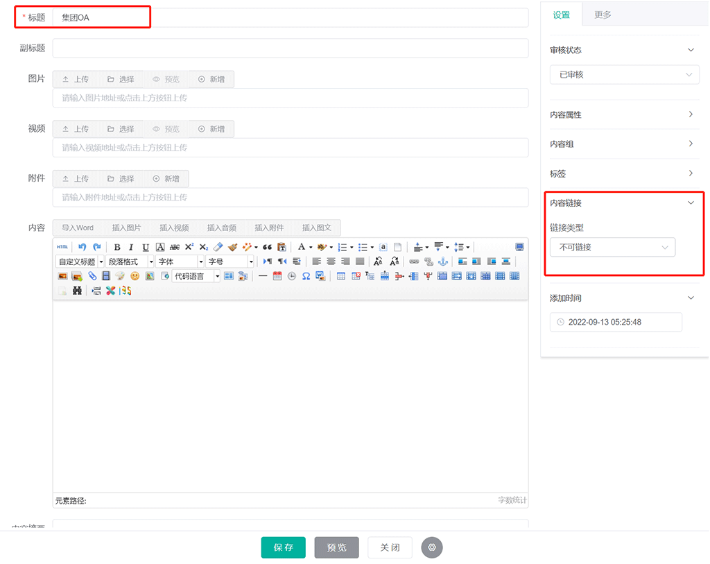 如果我们希望点击链接后进入指定页面,可以在内容编辑界面修改外部链接,点击链接后页面将跳转至我们设置的地址中,如果希望设置为不可点击,链接类型设置为不可链接即可。