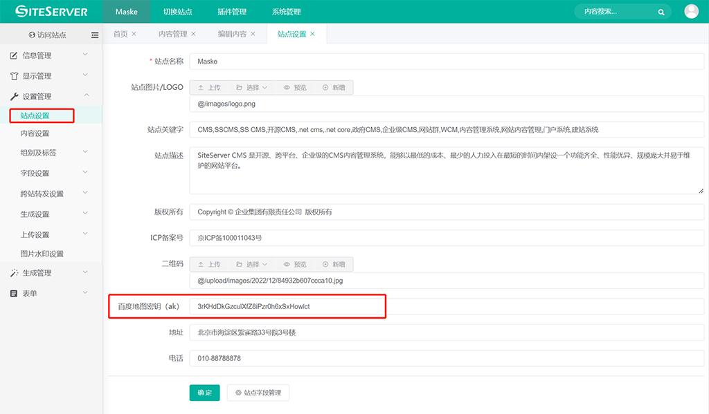 完成百度地图密钥(ak)申请后,在 SSCMS 后台进入站点设置界面:
