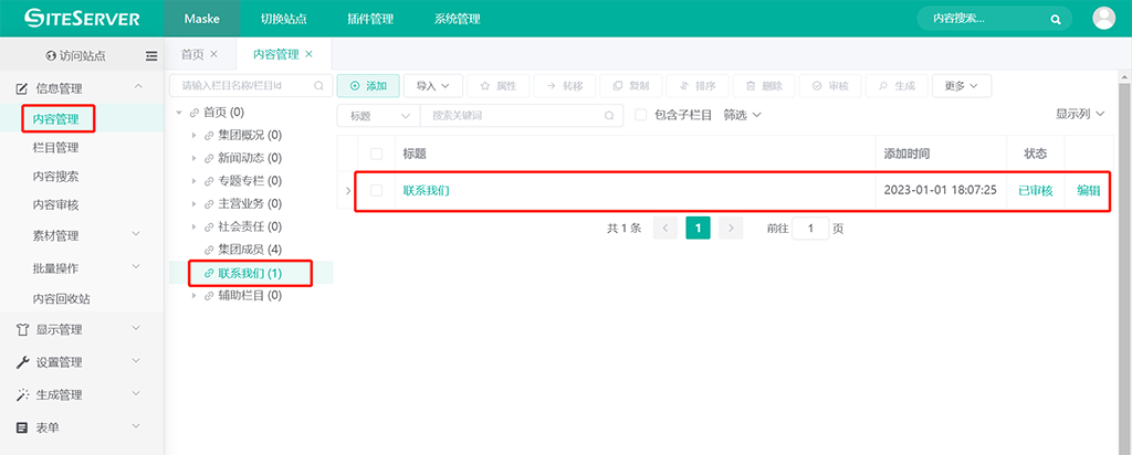 进入 SSCMS 后台 信息管理 -> 内容管理 界面,找到栏目 联系我们: