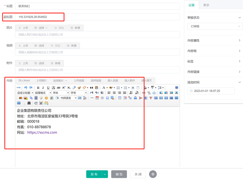 其中副标题为地图的经纬度,内容为显示在联系我们右侧的文字信息;联系我们页面中使用了百度地图显示功能,需要申请申请百度地图密钥并设置经纬度。