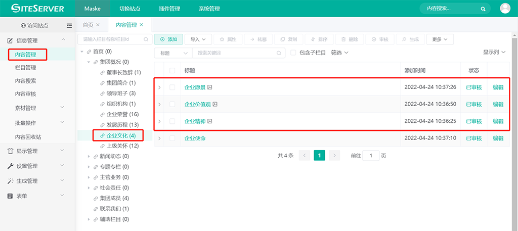 进入 SSCMS 后台 信息管理 -> 内容管理 界面,找到栏目 企业文化: