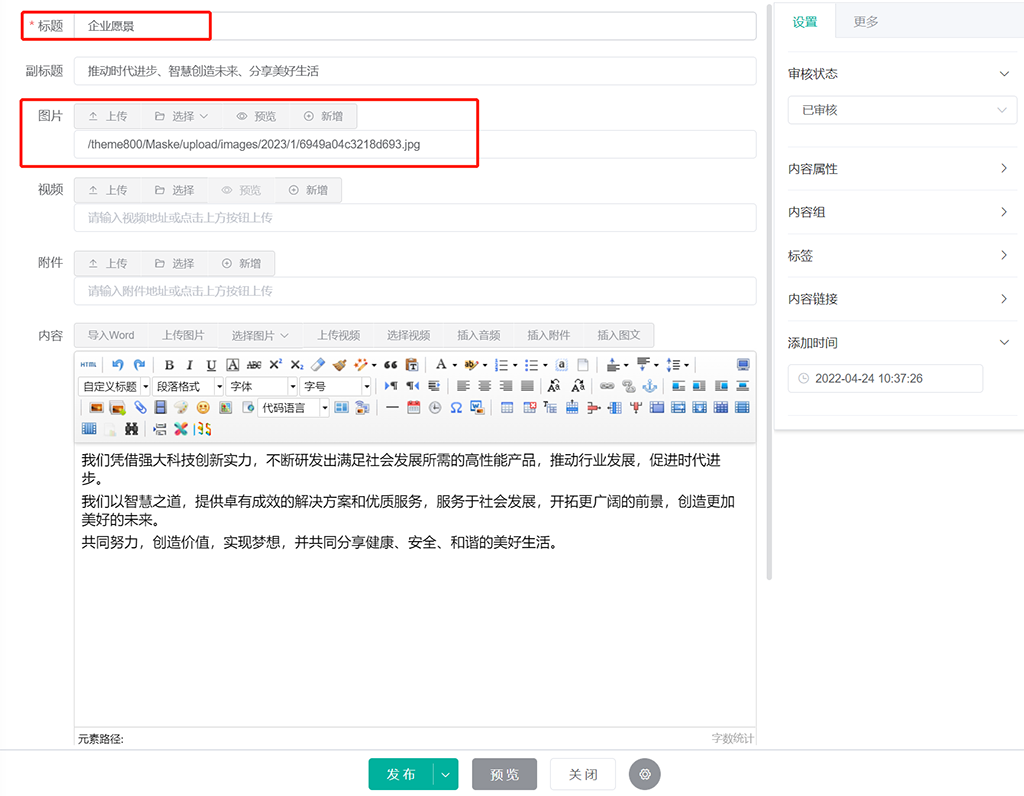 在此修改内容标题以及图片,点击保存重新生成首页,刷新浏览器即可看到首页企业文化的变化。