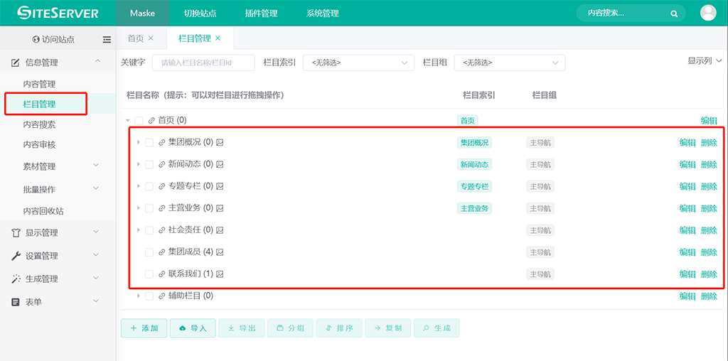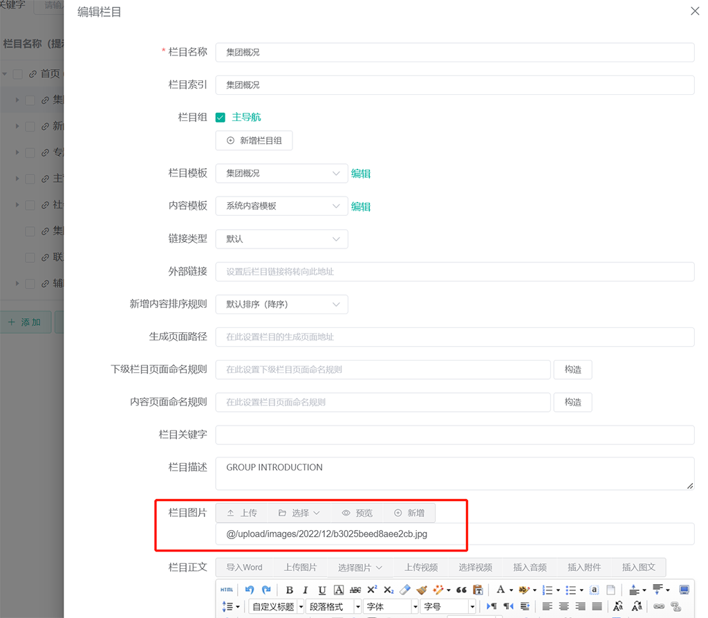 点击一级栏目右侧的 编辑 按钮,进入栏目编辑界面: