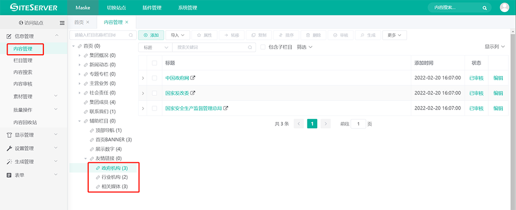 进入 SSCMS 后台 信息管理 -> 内容管理 界面,找到栏目 友情链接 的下级栏目: